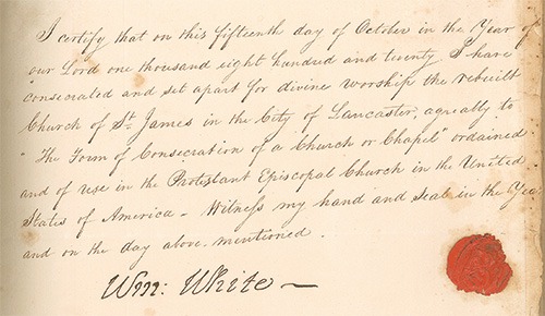 I certify that on the 15th day of October in the year of our Lord One Thousand Eight hundred and Twenty, I have consecrated and set apart for divine worship the rebuilt Church of St. James in the City of Lancaster, agreeably to the form of consecration of a church or chapel ordained and of one in the Protestant Episcopal Church in the United States of America. Witness my hand and seal in the year and on the day above mentioned.